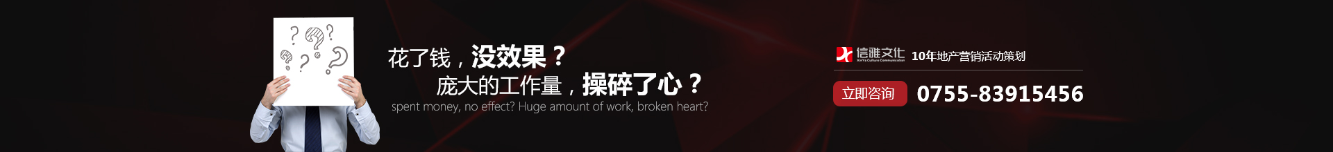 深圳市蒼宇國際文化傳播有限公司,深圳專業(yè)從事地(dì)産行(xíng)業(yè)營銷活動策劃公司,信雅文(wén)化憑借對行(xíng)業(yè)精準營銷深入領悟,以成效卓著的(de)專業(yè)優勢獲得客戶一緻肯定。探索真正有(yǒu)效的(de)地(dì)産營銷方式,服務涵蓋樓盤奠基活動、營銷中心開(kāi)放(fàng)活動、樣闆房開(kāi)放(fàng)活動、認籌活動、暧場(chǎng)活動、圈層活動、巡展活動、開(kāi)盤活動、樓盤入夥等活動。信雅文(wén)化緻力打造地(dì)産營銷活動領域第一品牌,先後與地(dì)産行(xíng)業(yè)一線品牌企業(yè)建立戰略合作關系:招商地(dì)産、佳兆業(yè)地(dì)産、金(jīn)地(dì)地(dì)産、華僑城地(dì)産、萬科地(dì)産、恒大(dà)地(dì)産、益田地(dì)産、龍光(guāng)城地(dì)産、遠洋地(dì)産、康達爾地(dì)産等衆多知名企業(yè)...